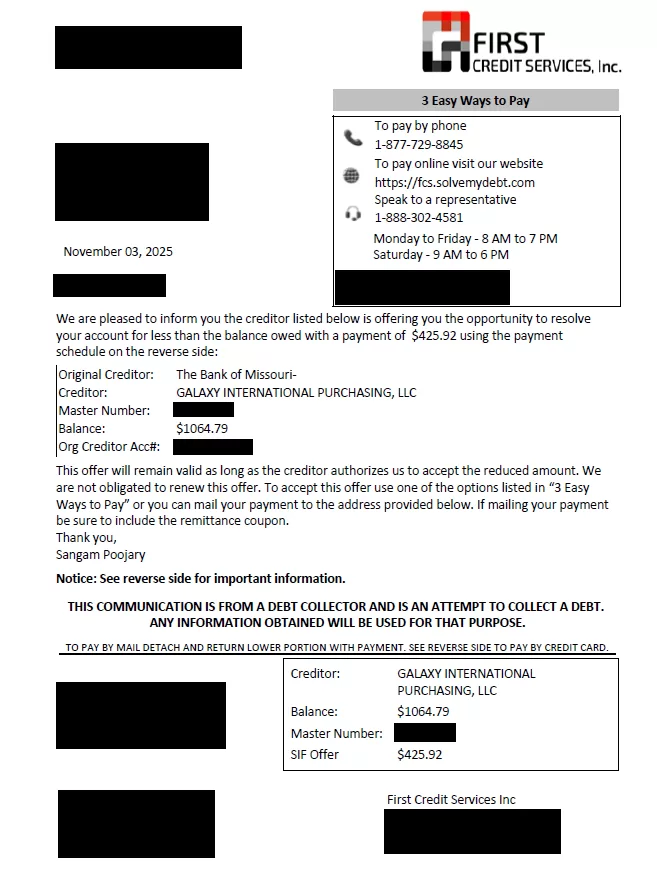 The following is a debt settlement letter for an account with Web Bank. The information below reflects the final negotiated terms as received by the client. In the letter, you can see the final settlement resolution, where the client saved over 60%. They paid only $425.92 on a balance owed of $1,064.79.