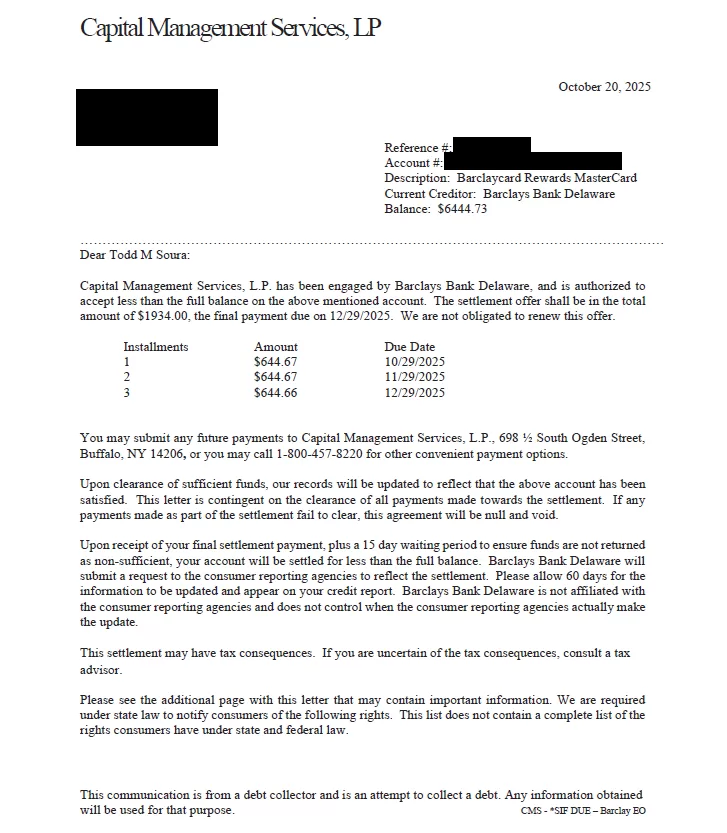 The following is a debt settlement letter for an account with Barclays Bank. The information below reflects the final negotiated terms as received by the client. In the letter, you can see the final settlement resolution, where the client saved over 70%. They paid only $1934.00 on a balance owed of $6444.73.
