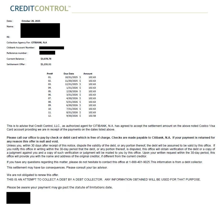 The following is a debt settlement letter for an account with Citybank. This letter showcases a successful negotiation where the client saved 60%. They paid back only $1,231.51 on the balance owed of $3,078.78.