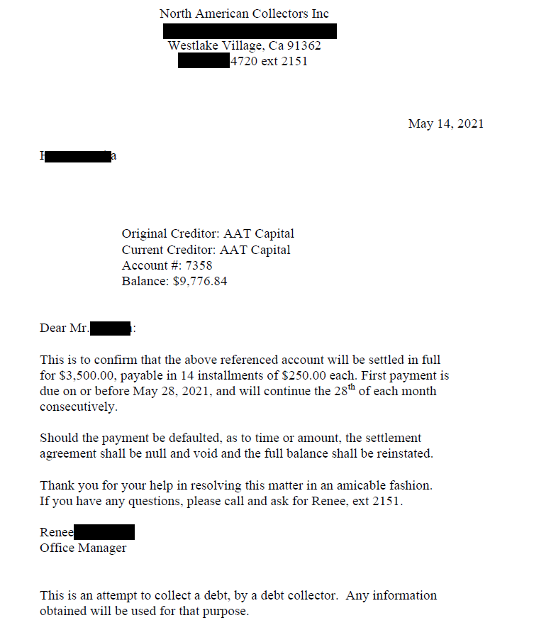 The following is a debt settlement letter for an account with AAT Capital. In the letter, you can see the final negotiated resolution where the client saved 65%. They paid back only $3,500.00 on the balance owed of $9,776.84.