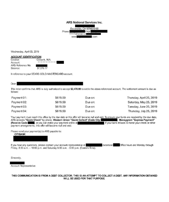 The following is a debt settlement letter for an account with CitiBank. In the letter, you can see the final negotiated resolution where the client saved 65%. They paid back only $2,478 on the balance owed of $7,079.17.