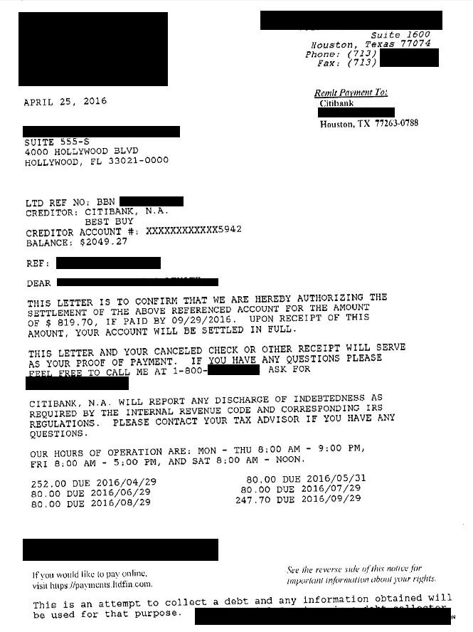 The following is a debt settlement letter for an account with Citibank USA. In the letter, you can see the final negotiated resolution where the client saved 60%. They paid back only $819.70 on the balance owed of $2,049.27.