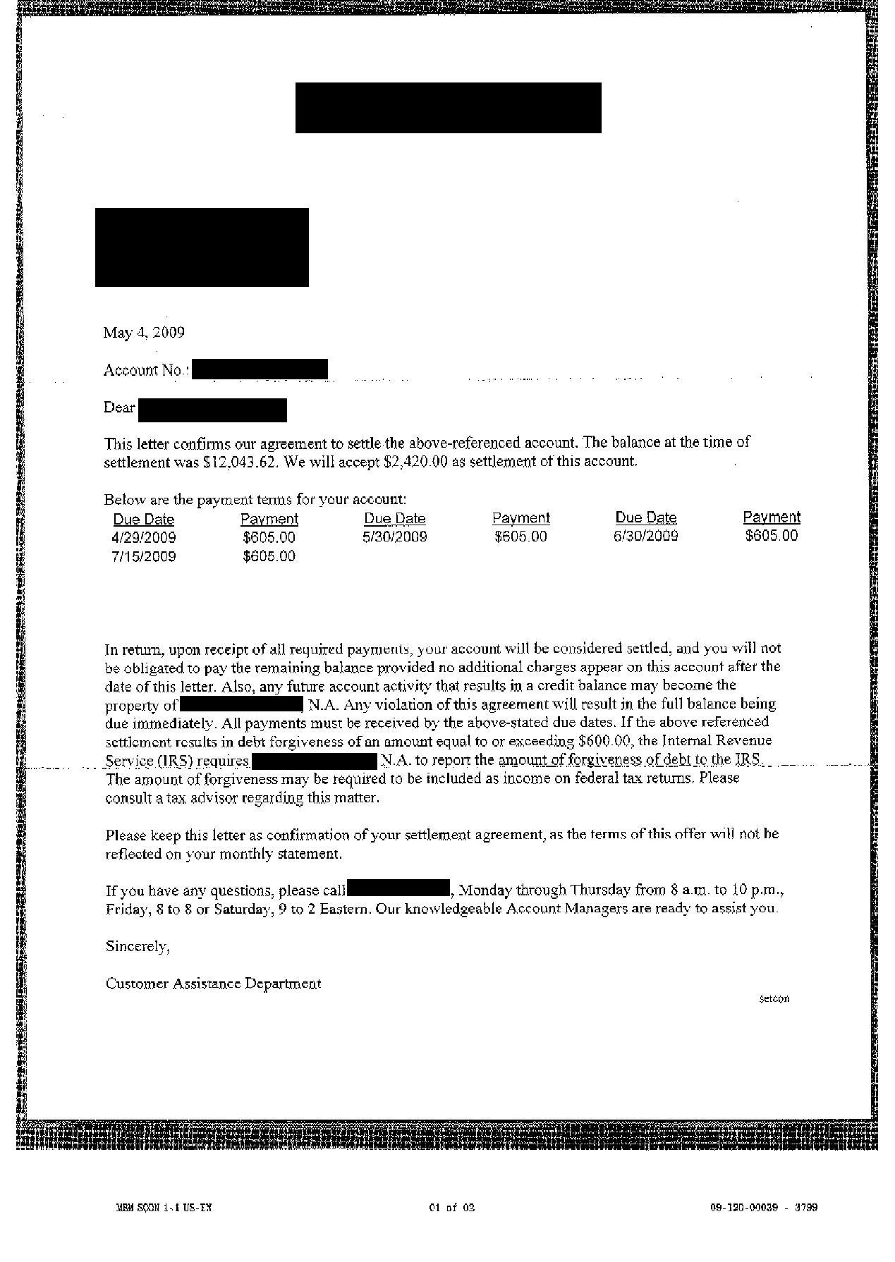 FIA Card Debt Settlement Letter August 2009