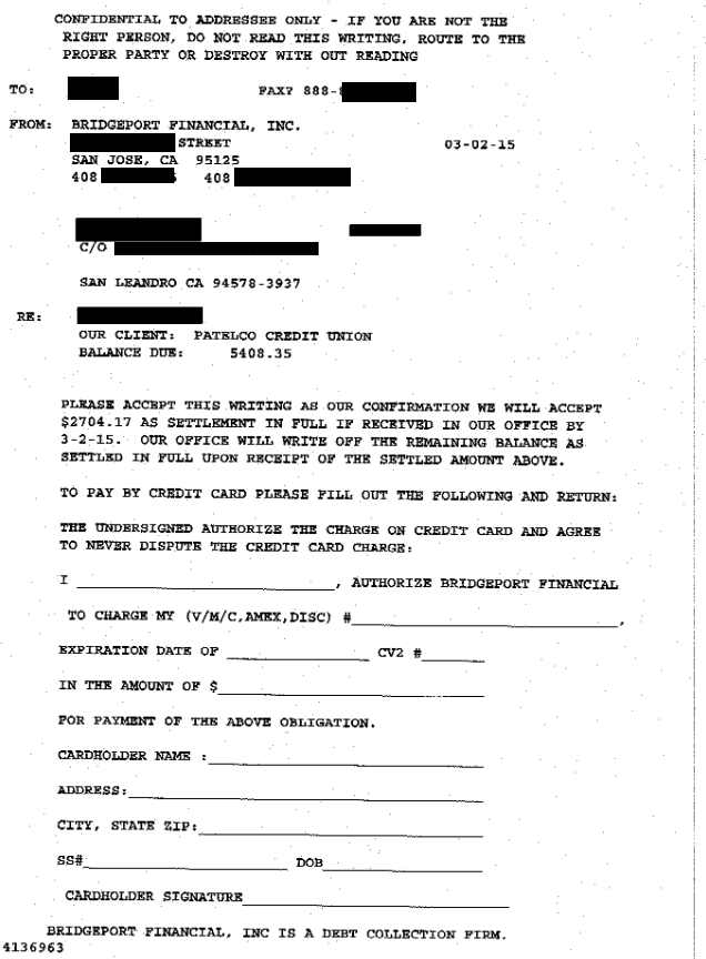The following is a debt settlement letter for an account with Patelco Credit Union. In the letter, you can see the final negotiated resolution where the client saved 50%. They paid back only $2,704.17 on the balance owed of $5,408.35.