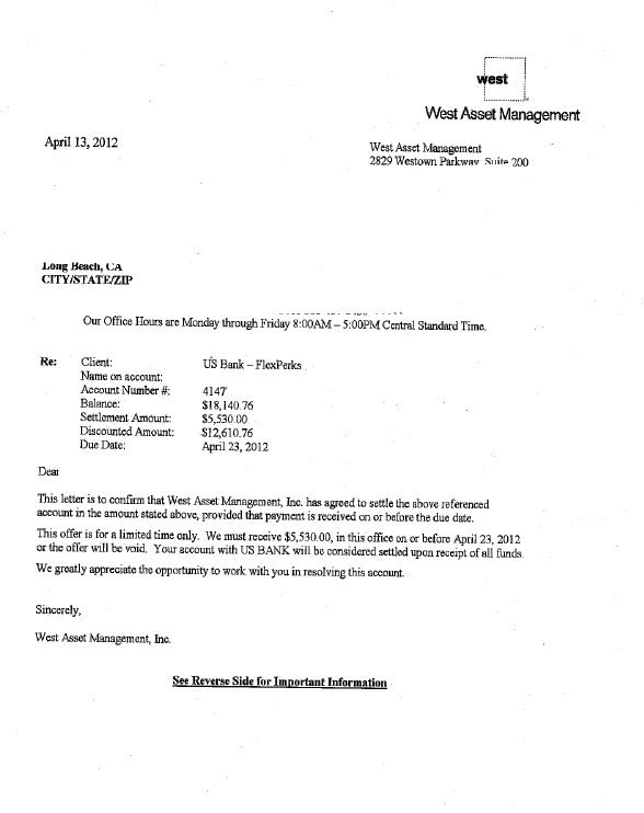 US Bank Debt Settlement Letter April 2012