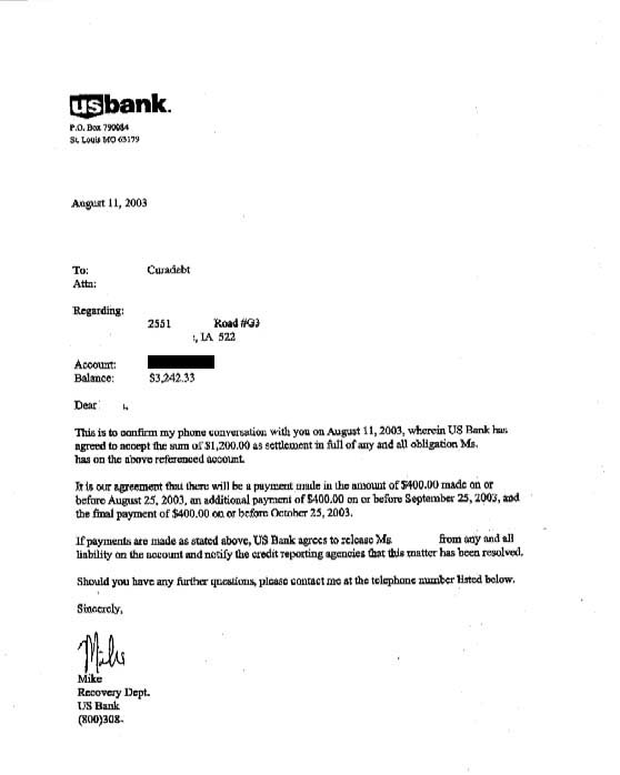 The following is a debt settlement letter for US Bank. In the letter, you can see the final negotiated resolution where the client saved 63%. They paid back only $1,200 on the balance owed of $3,242.33.