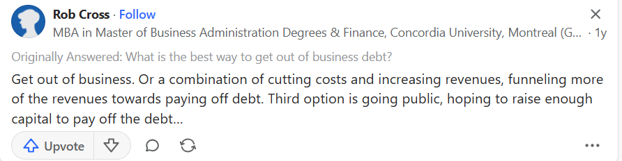 En Quora: Otro usuario preguntó cómo gestionar la deuda empresarial. Esta publicación recibió varias respuestas que afirmaron lo que hemos discutido y otras perspectivas.