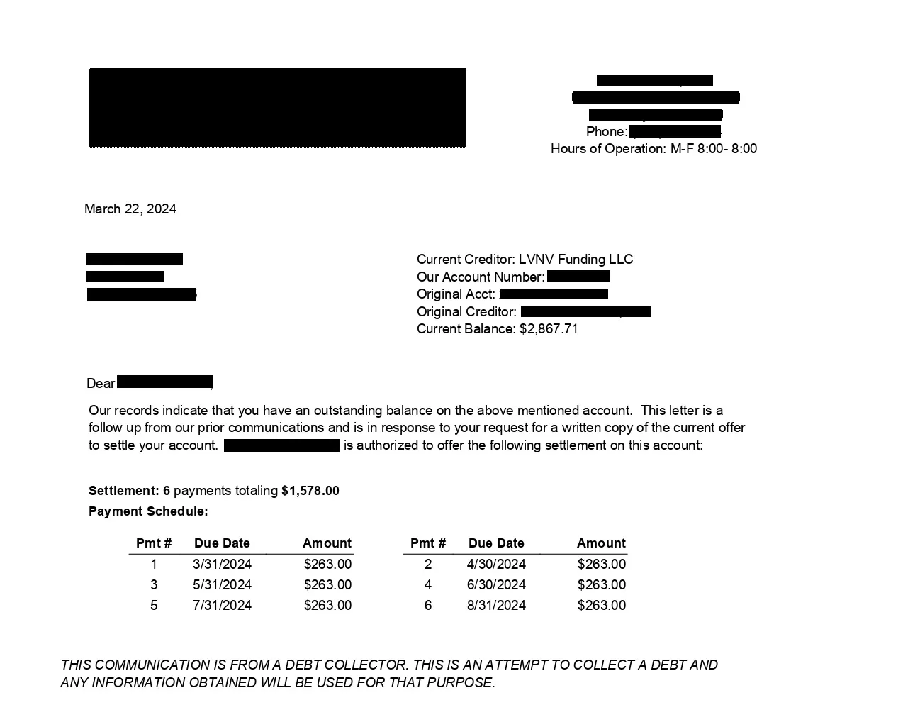 Carta de Liquidación de Deuda de LVNV Funding de Marzo de 2024