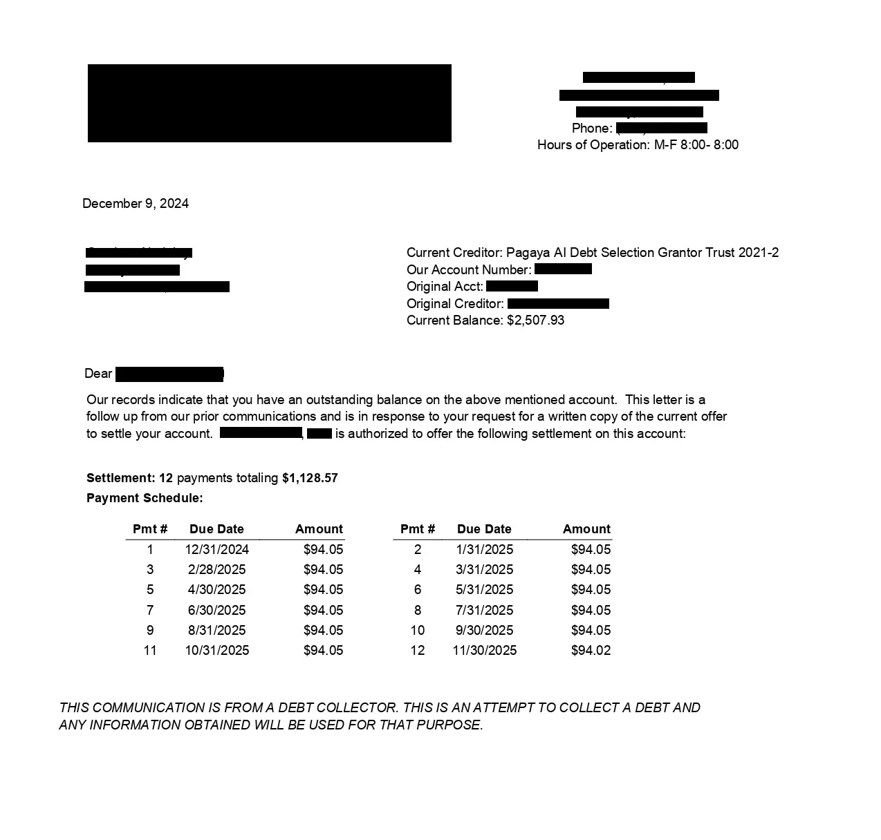 Carta de Liquidación de Deuda de Pagaya AI de Diciembre de 2024