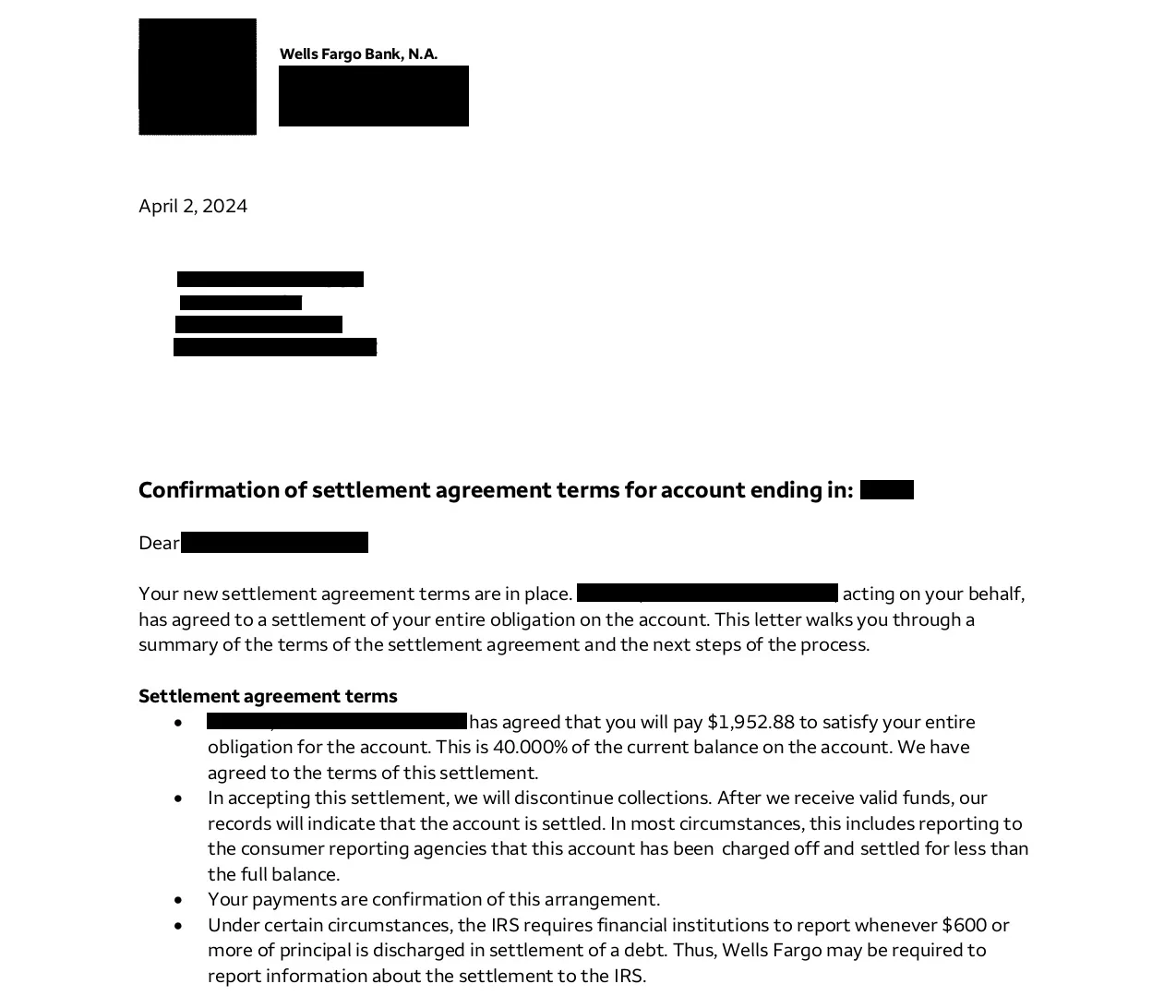 Éxito Real: Carta de Liquidación de Deuda de Wells Fargo de Abril 2024