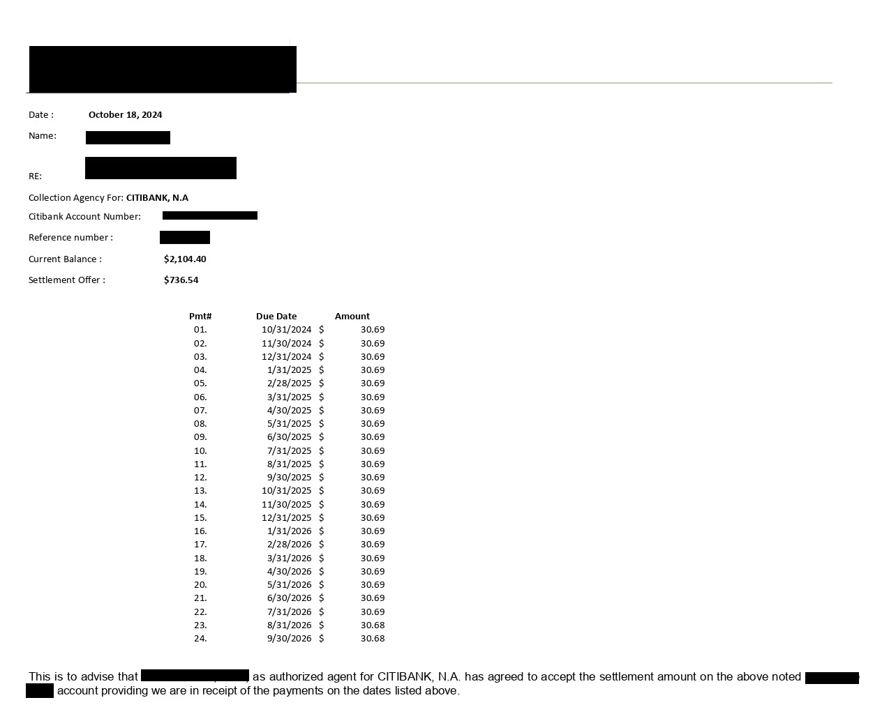 Esta oferta de acuerdo se refiere a una cuenta de CITIBANK con un saldo actual de $2,104.40, negociado exitosamente a $736.54, resultando en un 65% de ahorro. Los pagos se estructuran en 24 cuotas, con montos mensuales de $30.69, finalizando en septiembre de 2026.