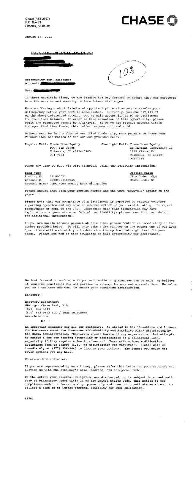 Carta de Liquidación de Deuda del Banco Chase Agosto 2011