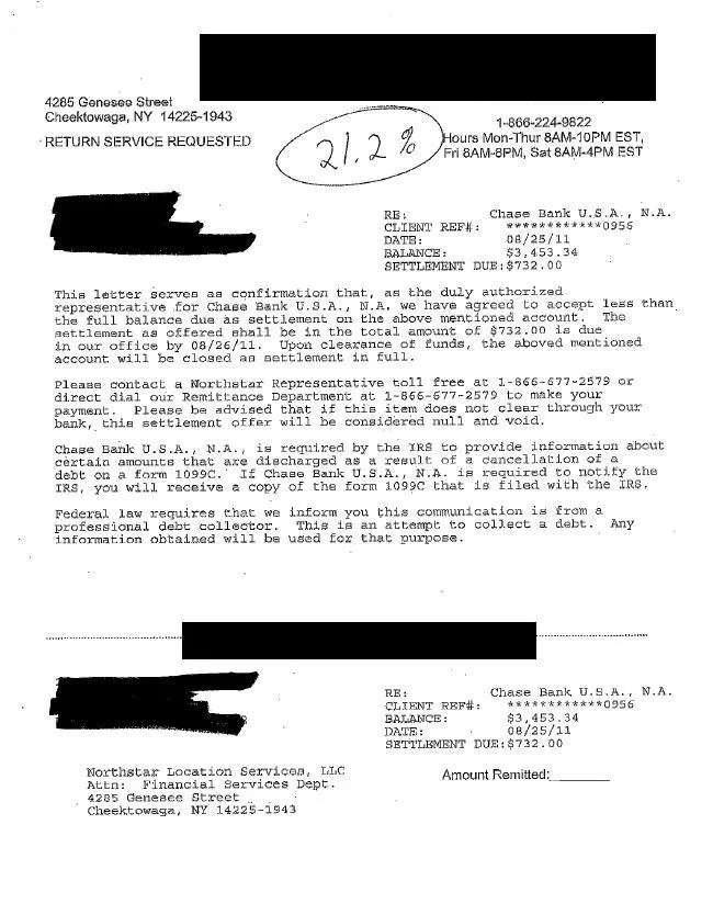 La siguiente es una carta de liquidación de deuda para Chase Bank. En la carta, se puede ver la resolución final negociada donde el cliente ahorró un 78.8%. Pagaron solo $732.00 del saldo adeudado de $3,453.34.