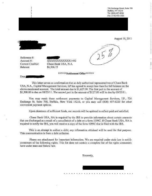 Lo siguiente es una carta de liquidación de deuda para Chase Bank de Omaha. En la carta, puedes ver la resolución final negociada donde el cliente ahorró un 75%. Solo pagaron $1,627.00 del saldo adeudado de $6,506.75.