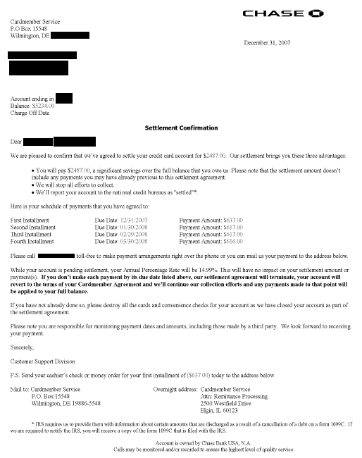 Carta de Liquidación de Deuda de Chase Bank Diciembre 2007