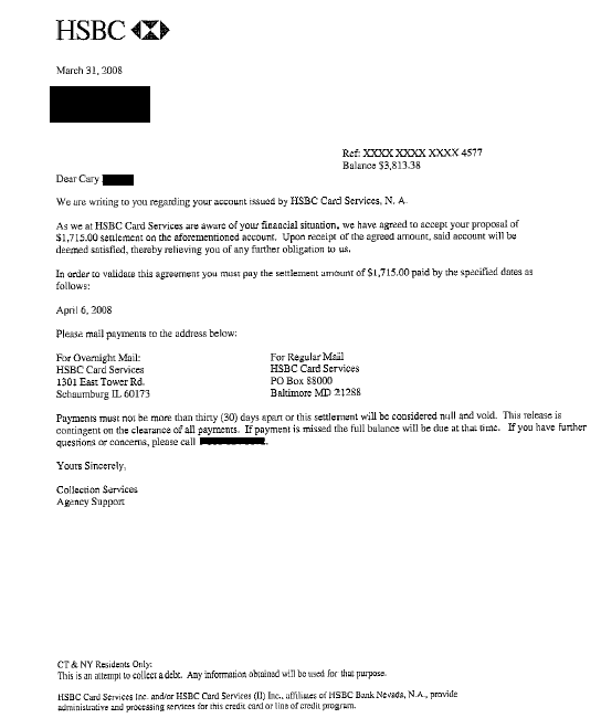 Lo siguiente es una carta de liquidación de deuda para el Banco HSBC. En la carta, puedes ver la resolución final negociada donde el cliente ahorró un 56%. Solo pagaron $1,715.00 del saldo adeudado de $3,813.38.
