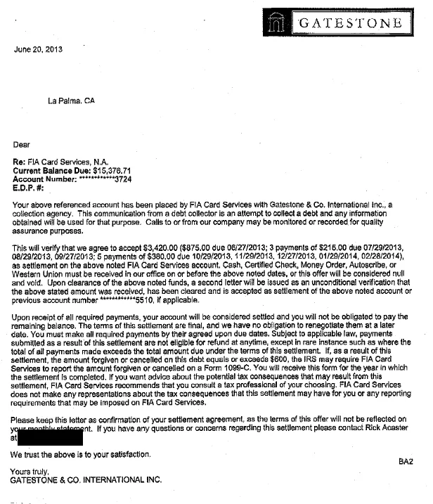 Lo siguiente es una carta de liquidación de deuda para una cuenta con Bank of America. En la carta, puede ver la resolución final negociada donde el cliente ahorró el 77%. Pagaron solo $3,420.00 del saldo adeudado de $15,376.71.