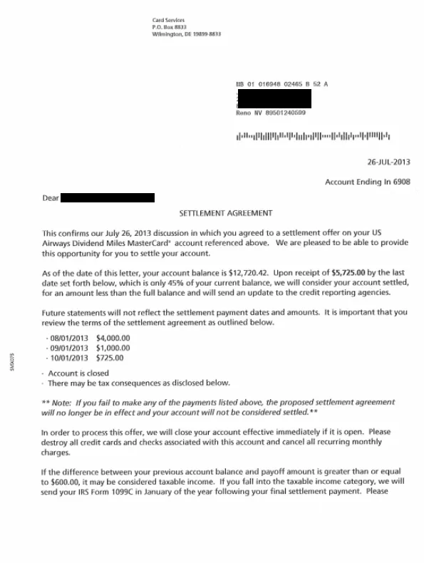 Lo siguiente es una carta de liquidación de deuda para Barclays. En la carta, se puede ver la resolución final negociada donde el cliente ahorró un 55%. Pagaron solo $5,725.00 de un saldo adeudado de $12,720.42.