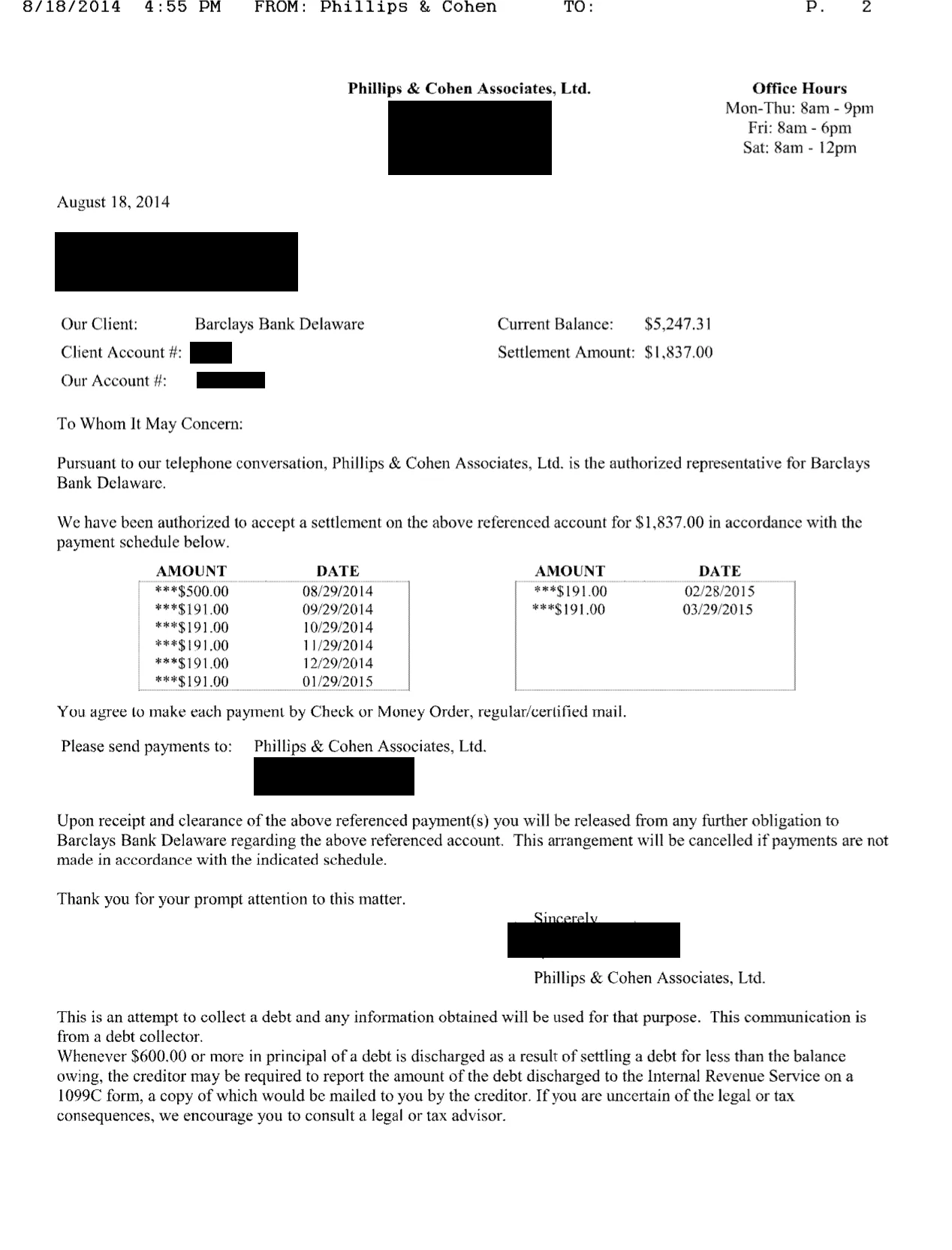 Carta de liquidación de deuda de Barclays Bank Delaware de agosto de 2014