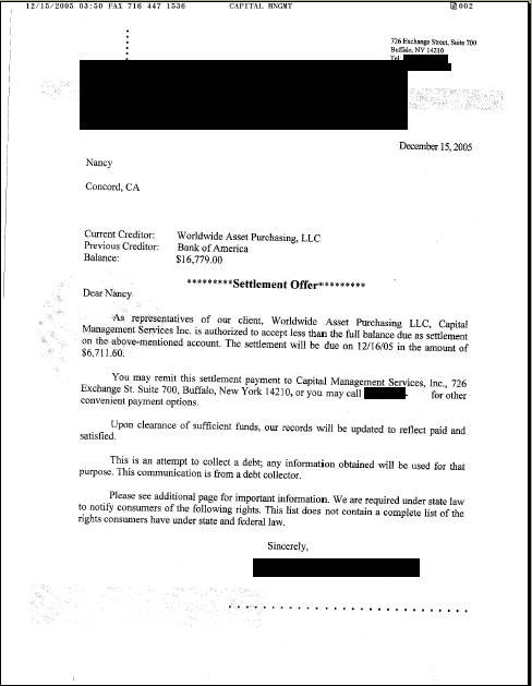 Carta de Liquidación de Deuda de Capital Management Services Inc. Diciembre de 2005