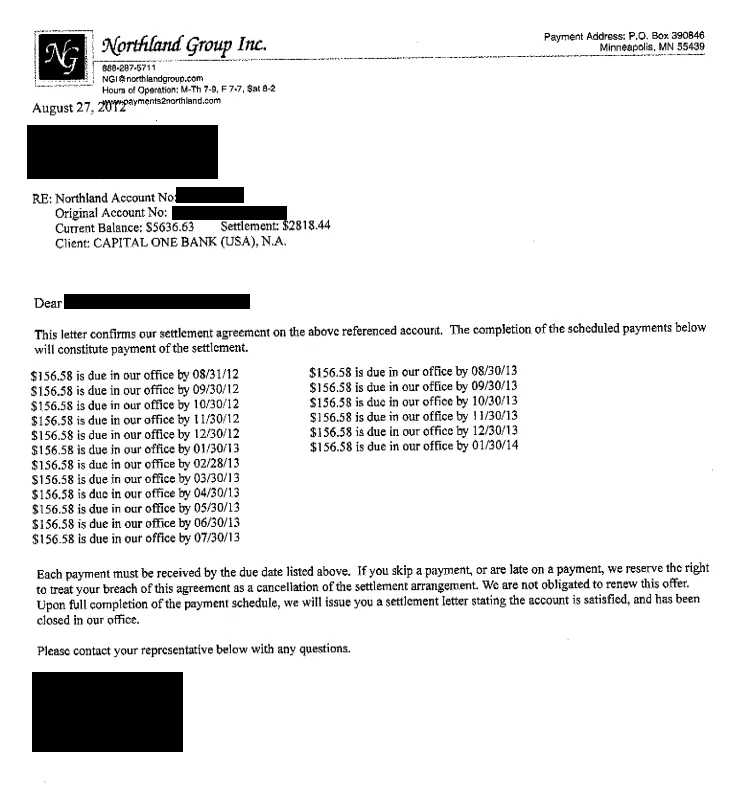 La siguiente es una carta de liquidación de deuda para Capital One Bank. En la carta, puede ver la resolución negociada final donde el cliente ahorró un 50%. Solo pagaron $2,818.44 de un saldo adeudado de $5,636.63.