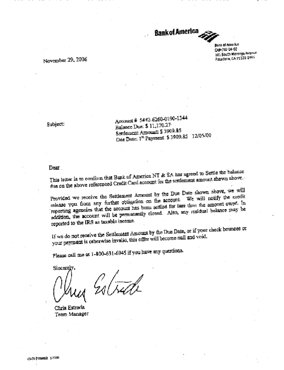Lo siguiente es una carta de liquidación de deuda para una cuenta con Bank of America. En la carta, puede ver la resolución final negociada donde el cliente ahorró un 65%. Solo pagaron $3,909 del saldo adeudado de $11,170.