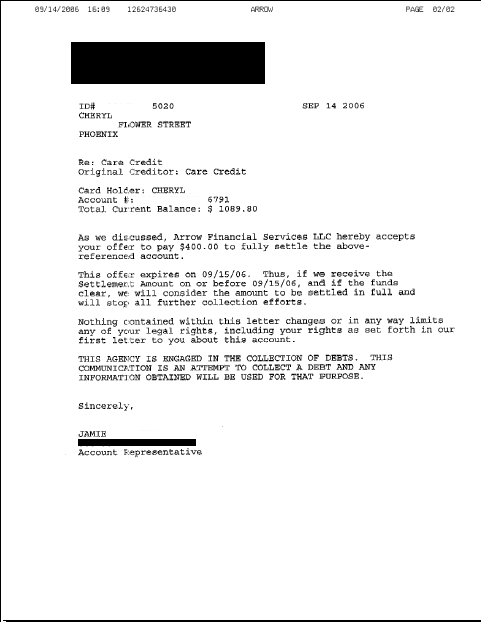 Carta de Liquidación de Deuda de Arrow Principal Services Septiembre 2006