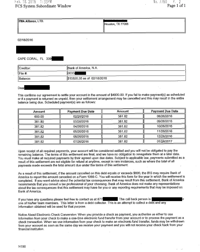 Lo siguiente es una carta de liquidación de deuda para una cuenta con Bank of America. En la carta, puedes ver la resolución final negociada donde el cliente ahorró el 70%. Pagaron solo $4,800.00 sobre el saldo adeudado de $15,820.35.