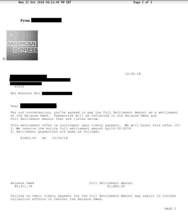 Carta de Liquidación de Deuda de American Express de Octubre de 2018