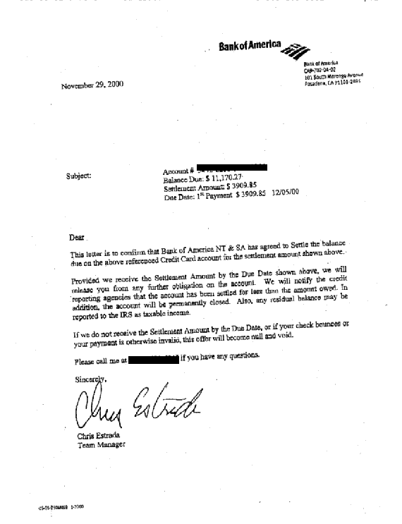 Carta de Liquidación de Deuda de Bank of America Noviembre 2000