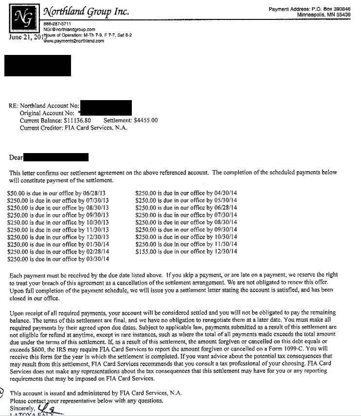 La siguiente es una carta de liquidación de deuda para una cuenta con Bank of America. En la carta, puedes ver la solución negociada final donde el cliente ahorró el 60%. Solo pagaron $4,455.00 del balance adeudado de $11,136.80.