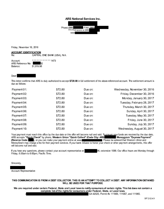 Lo siguiente es una carta de liquidación de deuda para una cuenta con Capital One Bank. En la carta, puede ver la resolución final negociada donde el cliente ahorró un 60%. Solo pagaron $728.00 sobre el saldo adeudado de $1,819.98.