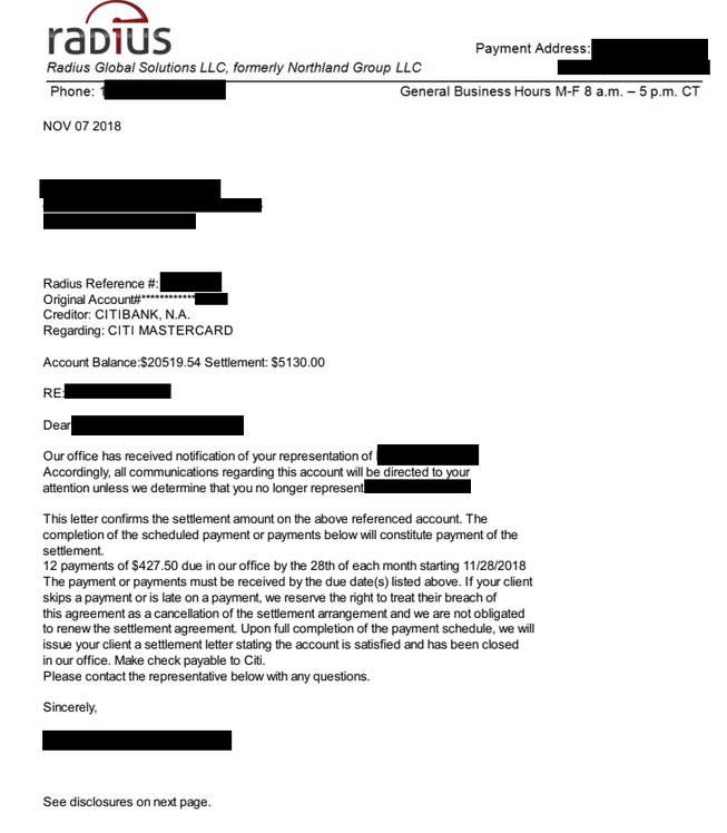 La siguiente es una carta de liquidación de deuda para una cuenta con CitiBank. En la carta, puede ver la resolución final negociada donde el cliente ahorró un 75%. Solo pagaron $5,130.00 sobre el saldo adeudado de $20,519.54.