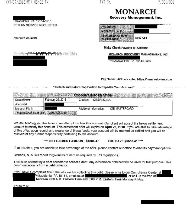 Lo siguiente es una carta de liquidación de deuda para una cuenta con Citibank USA. En la carta, puede ver la resolución final negociada donde el cliente ahorró un 75%. Solo devolvieron $1,884.47 sobre el saldo adeudado de $7,537.88.