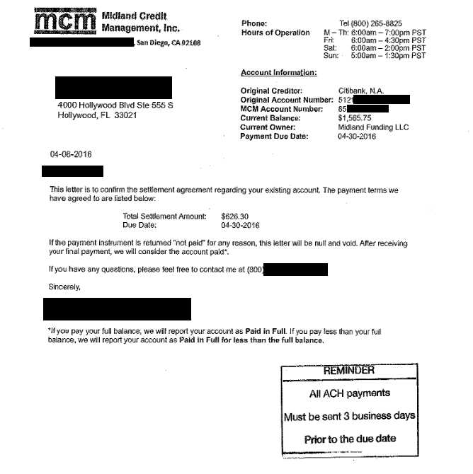 Lo siguiente es una carta de liquidación de deuda para una cuenta con Citibank USA. En la carta, puede ver la resolución final negociada donde el cliente ahorró un 60%. Solo pagaron $626.30 del saldo adeudado de $1,565.75.