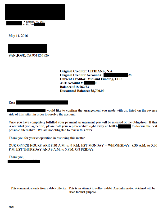 Carta de liquidación de deuda de Citibank USA America de mayo de 2016