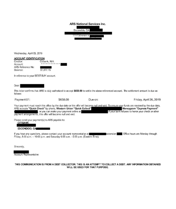 Lo siguiente es una carta de liquidación de deuda para una cuenta con Citibank USA. En la carta, puede ver la resolución final negociada donde el cliente ahorró el 65%. Solo pagaron $658 del saldo adeudado de $1,877.15.