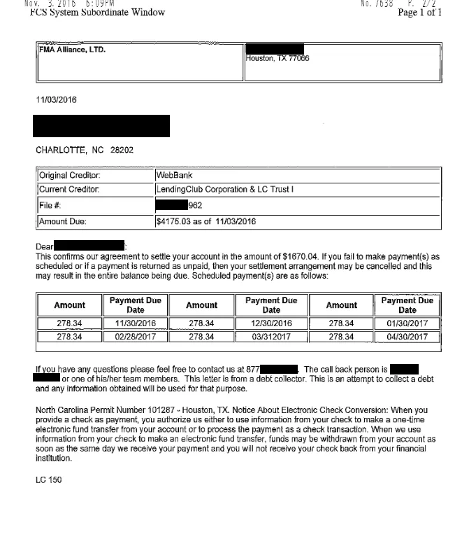Carta de liquidación de deuda de Lending Club de noviembre de 2016