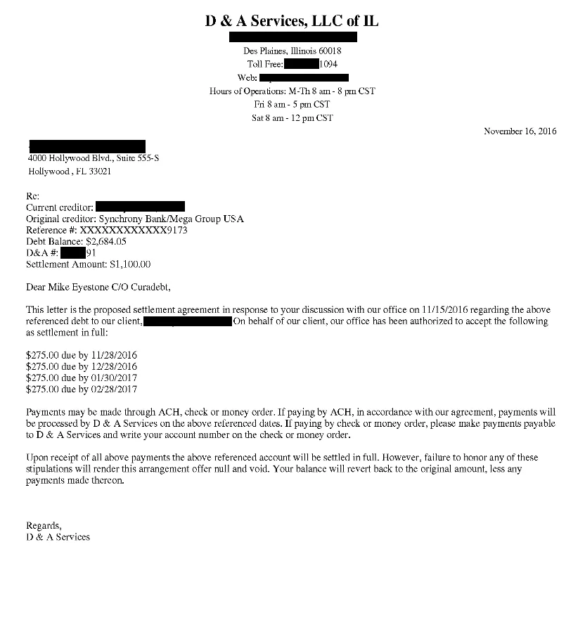 La siguiente es una carta de liquidación de deuda para una cuenta con el Banco Synchrony. En la carta, puede ver la resolución final negociada donde el cliente ahorró un 59%. Solo pagaron $1,100.00 del saldo adeudado de $2,684.05.
