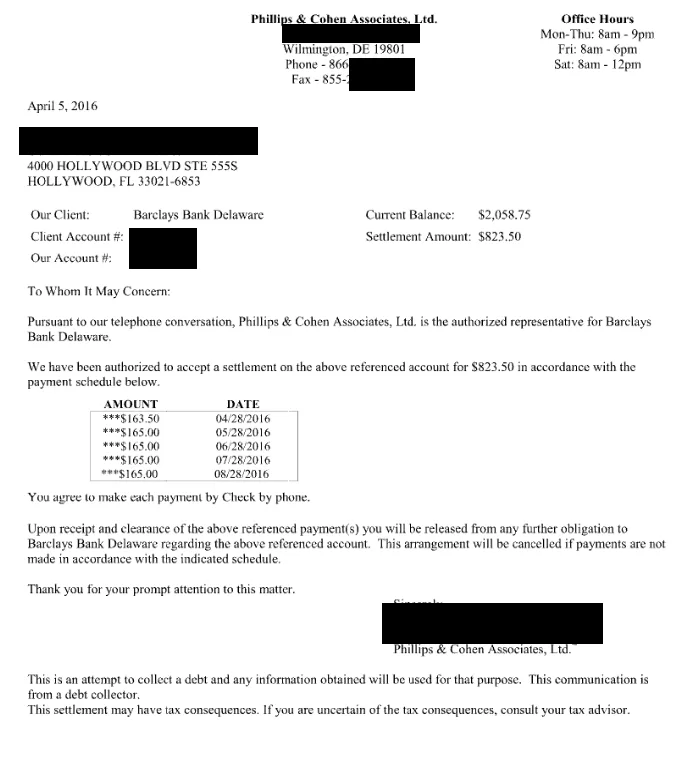 Lo siguiente es una carta de liquidación para el Banco Barclays. En la carta, puedes ver la resolución final negociada donde el cliente ahorró un 60%. Ellos pagaron solo $823.00 del saldo adeudado de $2,058.75.