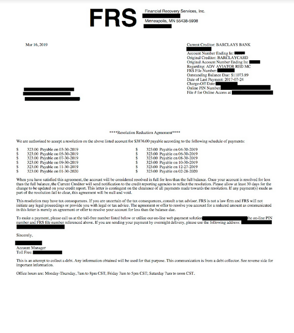La siguiente es una carta de liquidación de deuda para una cuenta con Barclays Bank. En la carta, puede ver la resolución final negociada donde el cliente ahorró un 65%. Solo pagaron $3,876 del saldo adeudado de $11,073.89.