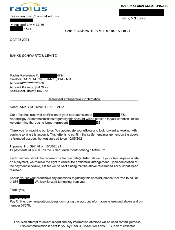 Lo siguiente es una carta de liquidación de deuda para una cuenta con Capital One Bank. En la carta, puedes ver la resolución final negociada donde el cliente ahorró un 70%. Solo pagaron $1043,78 del saldo adeudado de $3,479.29.