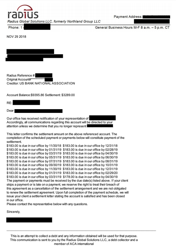 Lo siguiente es una carta de liquidación de deuda para una cuenta con el Banco de EE. UU. En la carta, puede ver la resolución final negociada donde el cliente ahorró un 65%. Solo pagaron $3,289.00 del saldo adeudado de $9,395.86.