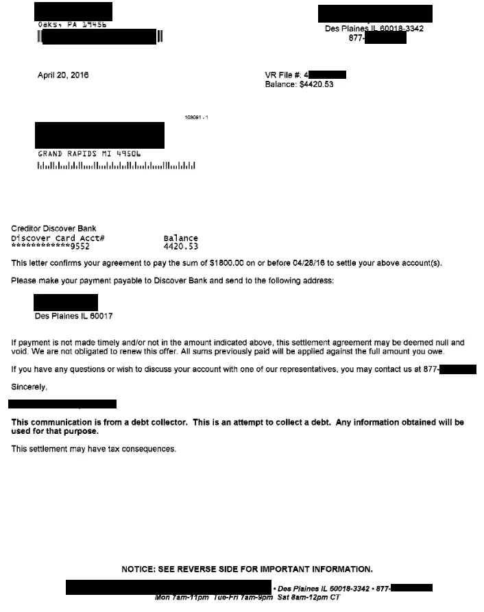 Carta de Liquidación de Deuda del Banco Discover de abril de 2016