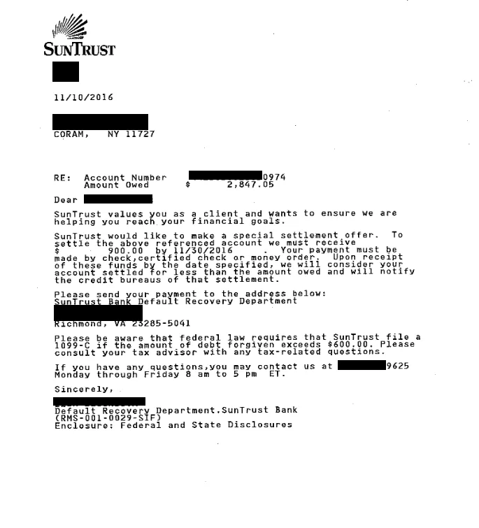 La siguiente es una carta de liquidación de deuda para una cuenta con SunTrust Bank. En la carta, puede ver la resolución negociada final donde el cliente ahorró un 68%. Solo pagaron $900.00 del saldo pendiente de $2,847.05.
