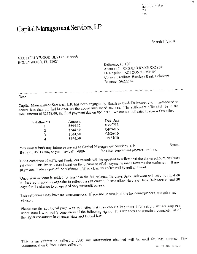 La siguiente es una carta de liquidación de deuda para una cuenta con el Banco Barclays. En la carta, puede ver la resolución final negociada donde el cliente ahorró un 65%. Solo pagaron $2,178.00 sobre el saldo adeudado de $6,222.84.