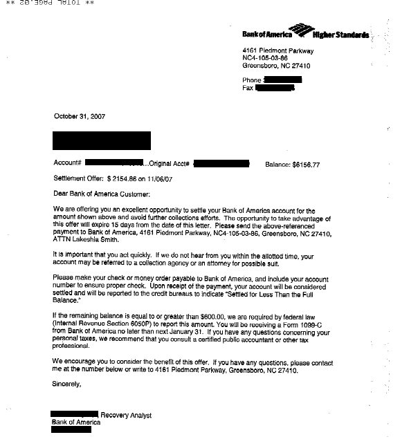 Carta de Liquidación de Deuda de Bank of America Octubre 2007