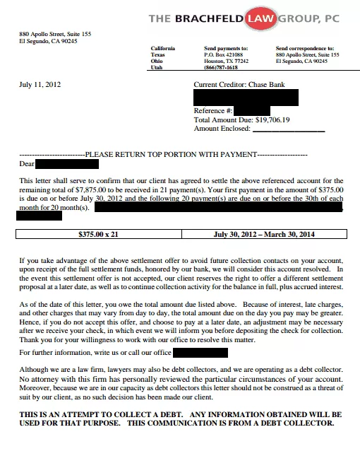 Lo siguiente es una carta de liquidación de deuda para el Banco Chase. En la carta, puede ver la resolución final negociada donde el cliente ahorró un 60%. Solo pagaron $7,875.00 del saldo adeudado de $19,706.19.
