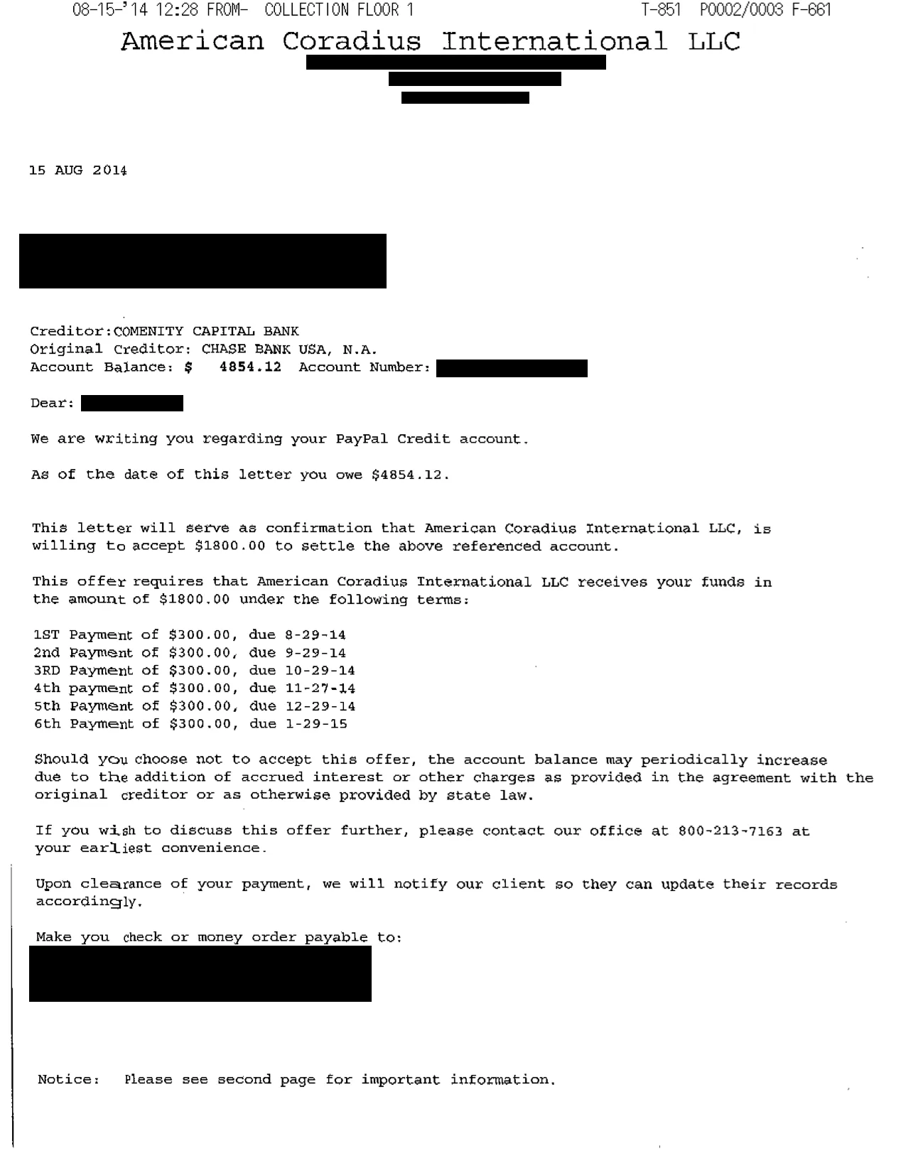 Carta de liquidación de deuda de Chase Bank USA America de agosto de 2014