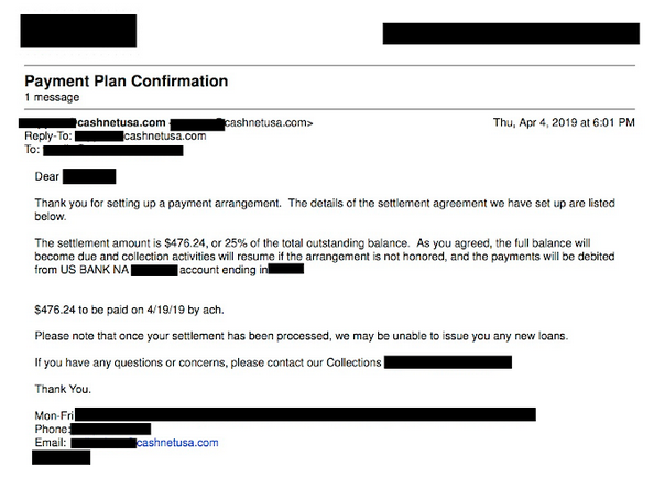 Carta de liquidación de deuda del US Bank desde abril de 2019